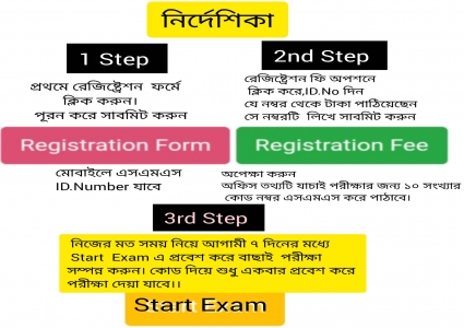পরীক্ষার কোড ব্যতীত কেউ পরীক্ষা দিতে পারবে না। প্রশ্নের ধরন: যেমন - বাংলাদেশের জাতীয় ফুলের নাম কি? (ক) শাপলা ফুল (খ)বেলী ফুল (গ)রজনীগন্ধা ফুল (ঘ)গোলাপ ফুল। এভাবে ৪ টি অপশন থাকবে, সঠিক উত্তরে টিক চিহ্ন দিতে হবে। * সময় ২৫ মিনিট।বাংলা, ইংরেজি ২টি ভার্ষনে প্রশ্ন থাকবে। পরীক্ষা চলাকালীন সময়ে প্রাপ্ত নম্বর Live স্কীনে দেখা যাবে।